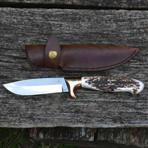 Farkas Bertalan vadászkés 03 modell agancs nyéllel kézzel készített, egyedi, prémium minőségben választható kézi monogram véséssel valódi bőr tokkal.
