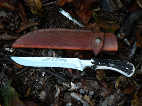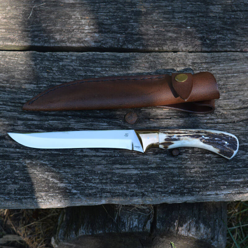 Farkas Bertalan vadászkés 06 modell agancs nyéllel kézzel készített, egyedi, prémium minőségben választható kézi monogram véséssel valódi bőr tokkal.
