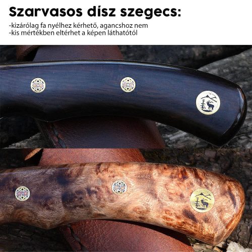 A fa vadászkés nyélanyagokhoz igény szerint választhatóak fém dísz szegecsek. (Szarvas agancs nyélhez sajnos nem lehetséges, mivel az agancs felülete rücskös, nem illeszthető be szépen a szegecs.)
