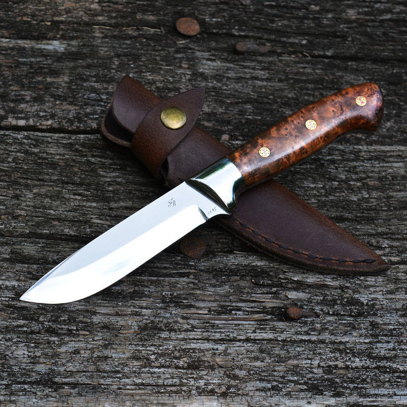Farkas Bertalan vadászkés 02 modell gyöngyöző tuja nyéllel kézzel készített, egyedi, prémium minőségben választható kézi monogram véséssel valódi bőr tokkal.