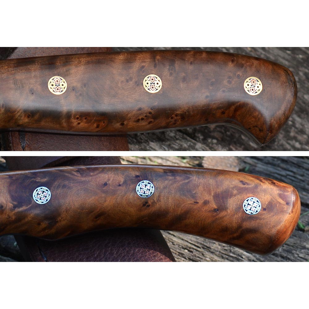 A fa vadászkés nyélanyagokhoz igény szerint választhatóak fém dísz szegecsek. (Szarvas agancs nyélhez sajnos nem lehetséges, mivel az agancs felülete rücskös, nem illeszthető be szépen a szegecs.)