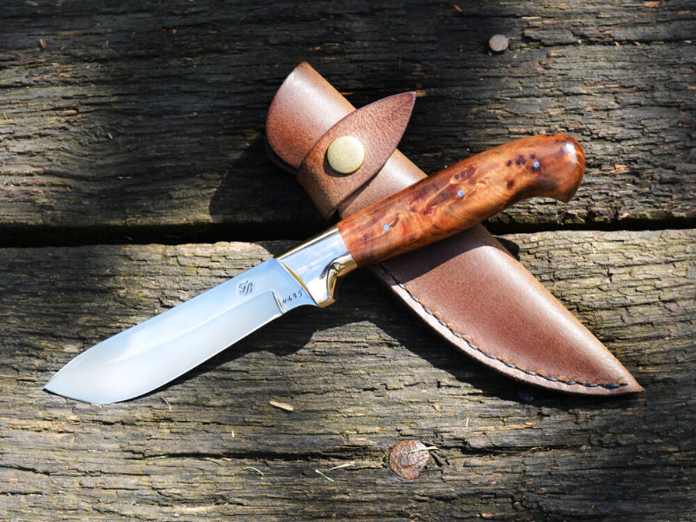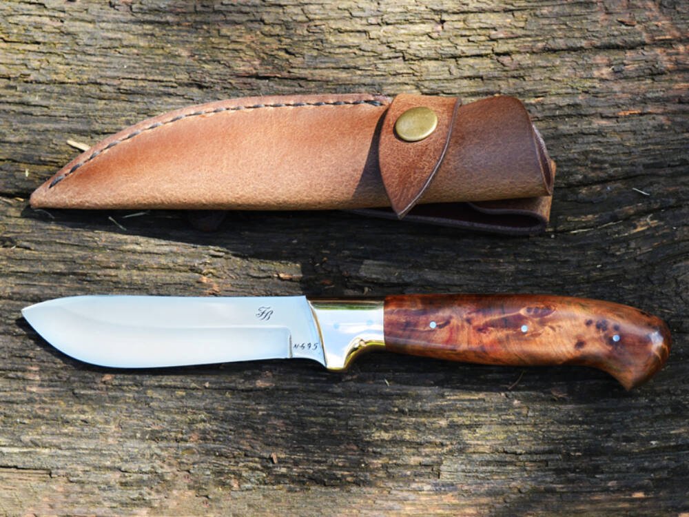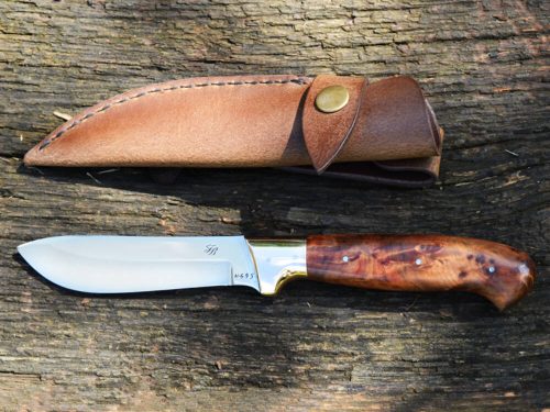 Farkas Bertalan vadászkés 10 modell gyöngyöző nyéllel kézzel készített, egyedi, prémium minőségben választható kézi monogram véséssel valódi bőr tokkal.