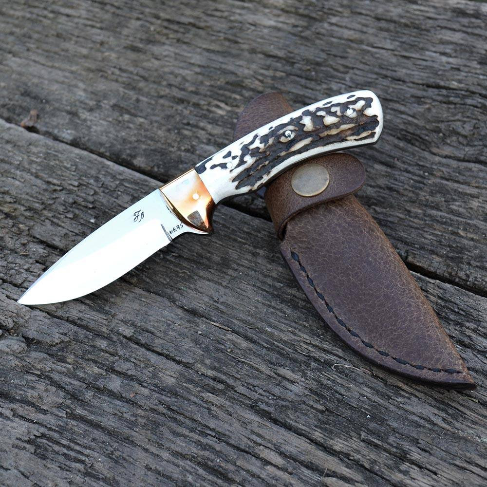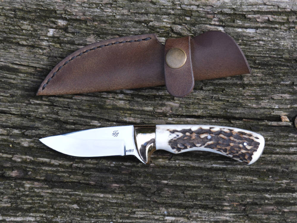Farkas Bertalan vadászkés MINI 11 modell agancs nyéllel kézzel készített, egyedi, prémium minőségben választható kézi monogram véséssel valódi bőr tokkal.
