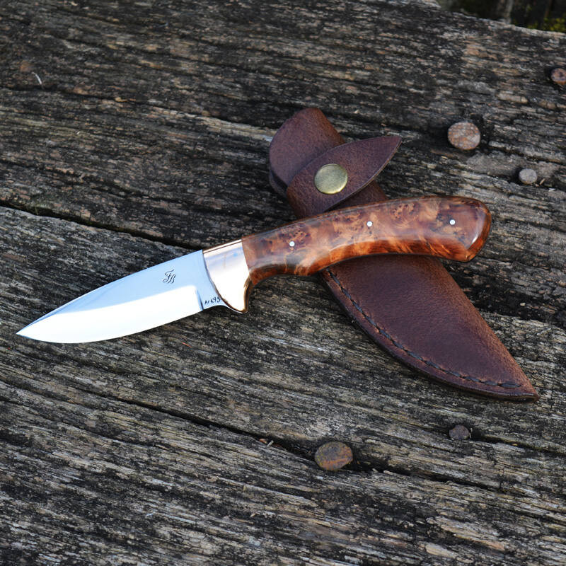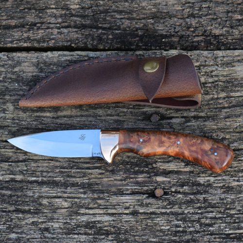 Farkas Bertalan vadászkés 11 modell gyöngyöző tuja nyéllel kézzel készített, egyedi, prémium minőségben választható kézi monogram véséssel valódi bőr tokkal.