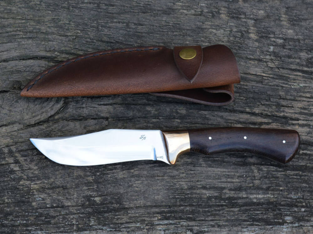 Farkas Bertalan vadászkés 15 modellgyöngyöző tuja nyéllel kézzel készített, egyedi, prémium minőségben választható kézi monogram véséssel valódi bőr tokkal.